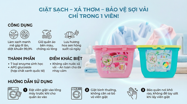 1 viên (15g) = 3–5kg quần áo (8–10 món)